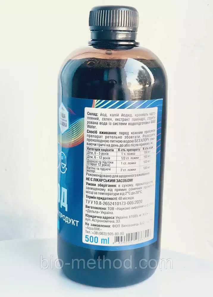 Склад: йод, калій йодид, крохмаль картопляний, селен, структурована вода із системи Аква БРК (Патент №127325).